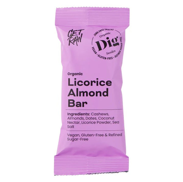Når lakrissuget melder seg, treffer denne baren blink. Den byr på svart lakris i hver eneste bit, pakket inn i en myk og seig blanding av mandler og cashewnøtter. De er tilsatt akkurat passe sødme fra dadler og kokosnektar – og en liten klype havsalt som løfter smaken ytterligere. Som alltid er den økologisk, vegansk og glutenfri.